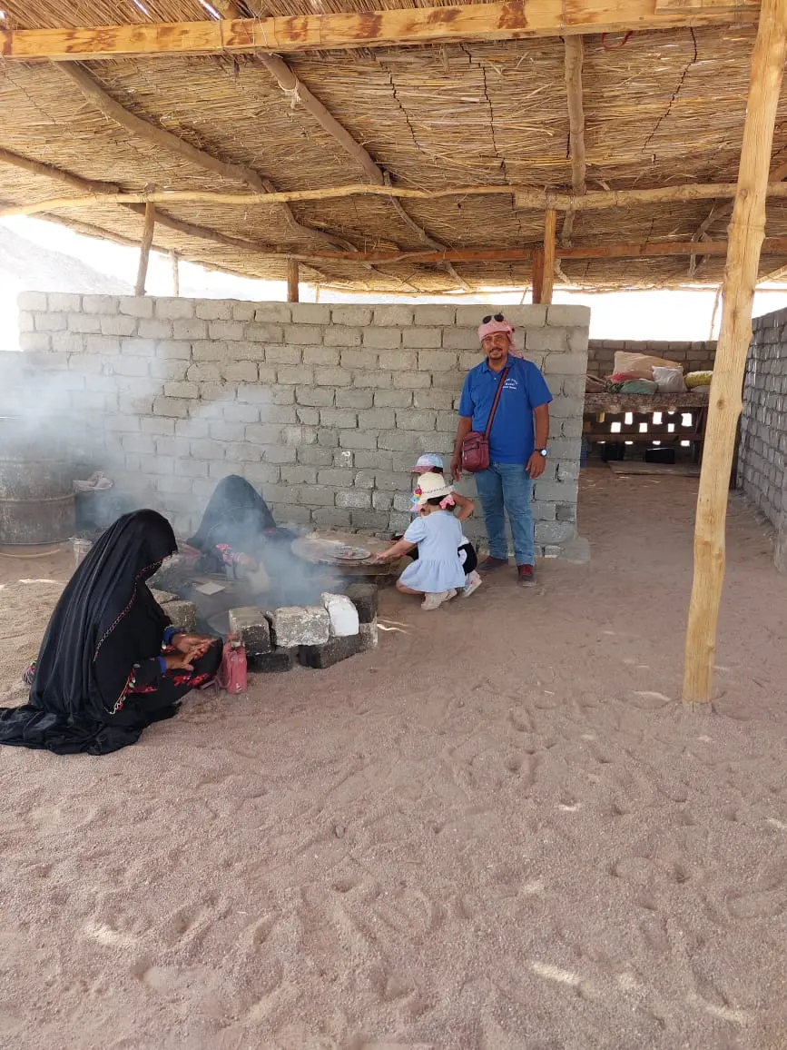 Afterward, they return to the Safari Center and then continue by jeep into the desert, heading to the Bedouin village. There, guests can enjoy a camel ride, drink traditional Bedouin tea, and experience authentic Bedouin life. They will see how Bedouins bake bread, learn about their traditional handicrafts, and visit the snake house.