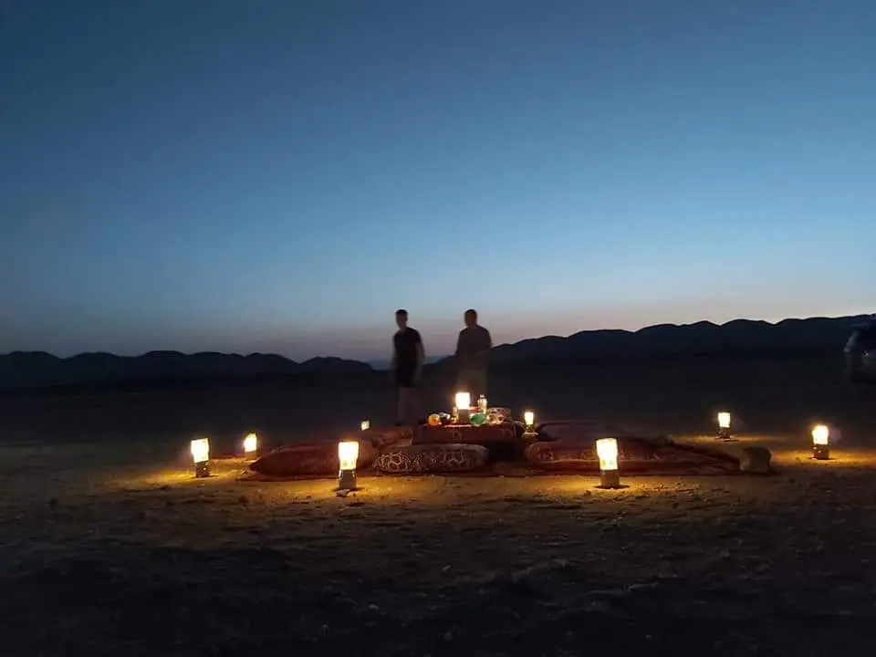 The tour then continues with a jeep ride back to the Safari Center or garage, where guests can enjoy sunset photography. This is followed by dinner, served as an open buffet, and an evening show featuring belly dancing, Tanoura dance, and a fire show.